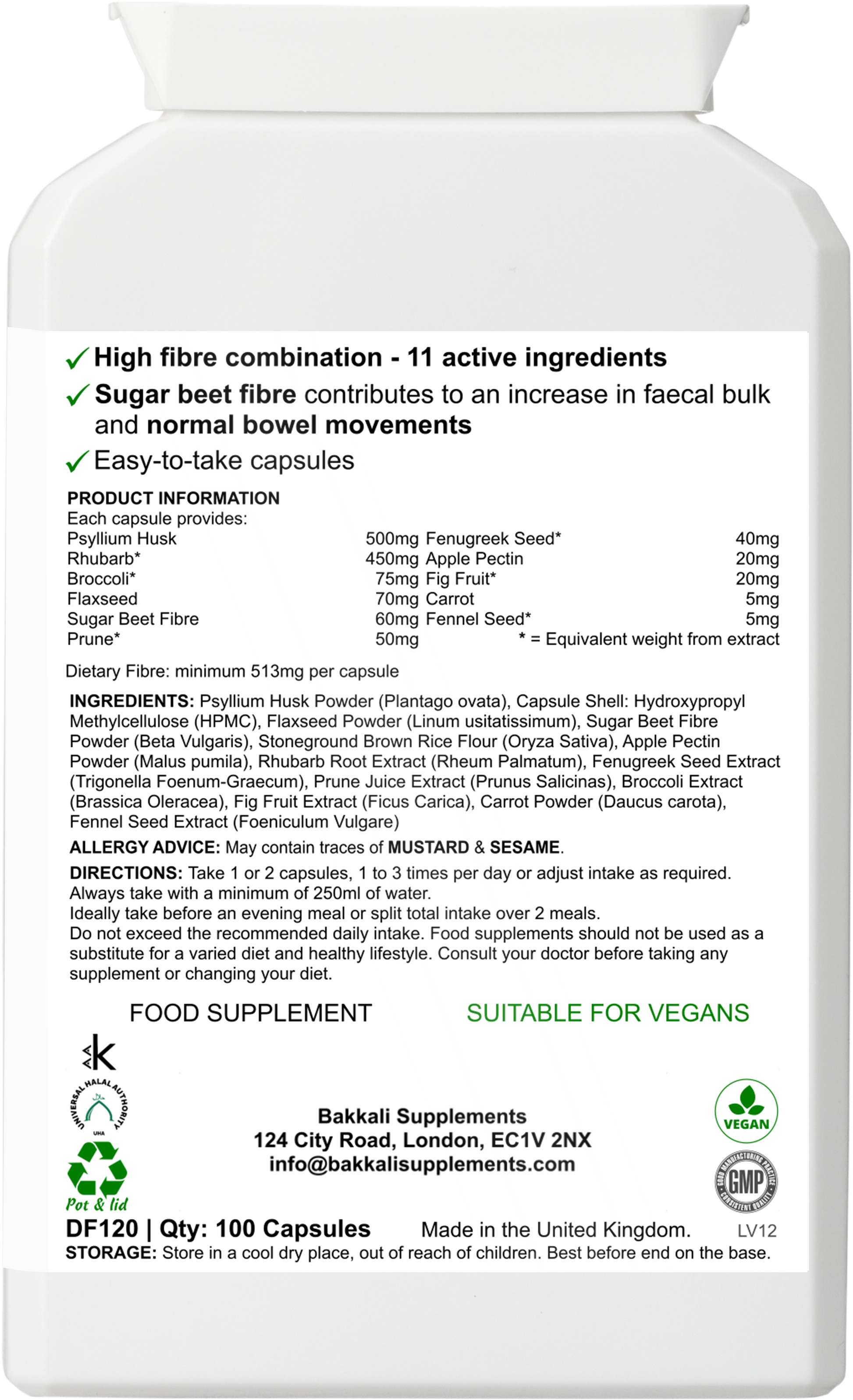 This advanced multi-fibre formula combines plant-based ingredients including psyllium husk, sugar beet fibre, flaxseed, apple pectin, prune, fig fruit, carrot, fennel seed, fenugreek seed, broccoli and rhubarb.